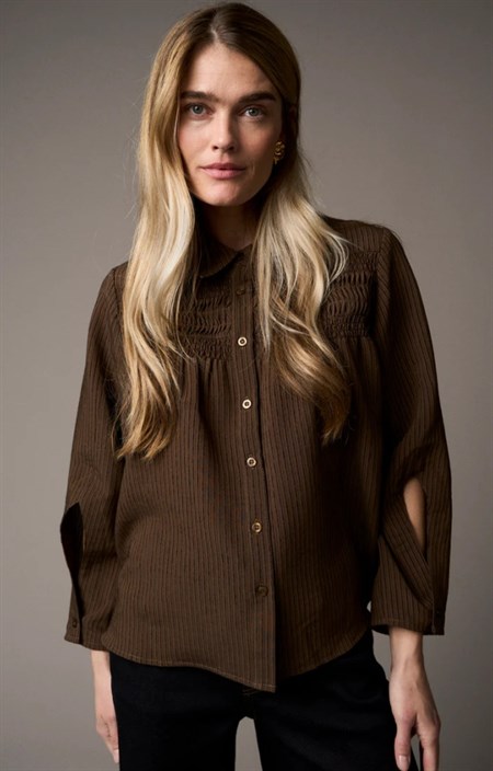 Den er fremstillet af blødt, stribet fløjl og har en delikat pintuck-smocking hen over brystet, der tilføjer volumen og struktur til den afslappede silhuet.