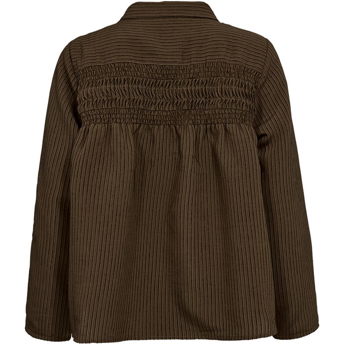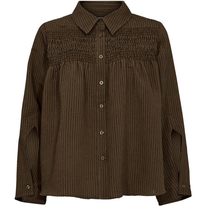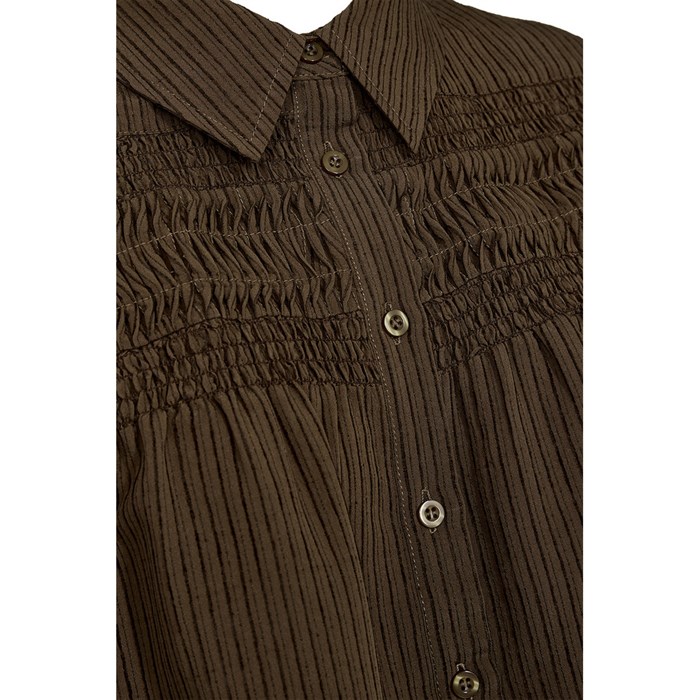 Den er fremstillet af blødt, stribet fløjl og har en delikat pintuck-smocking hen over brystet, der tilføjer volumen og struktur til den afslappede silhuet.